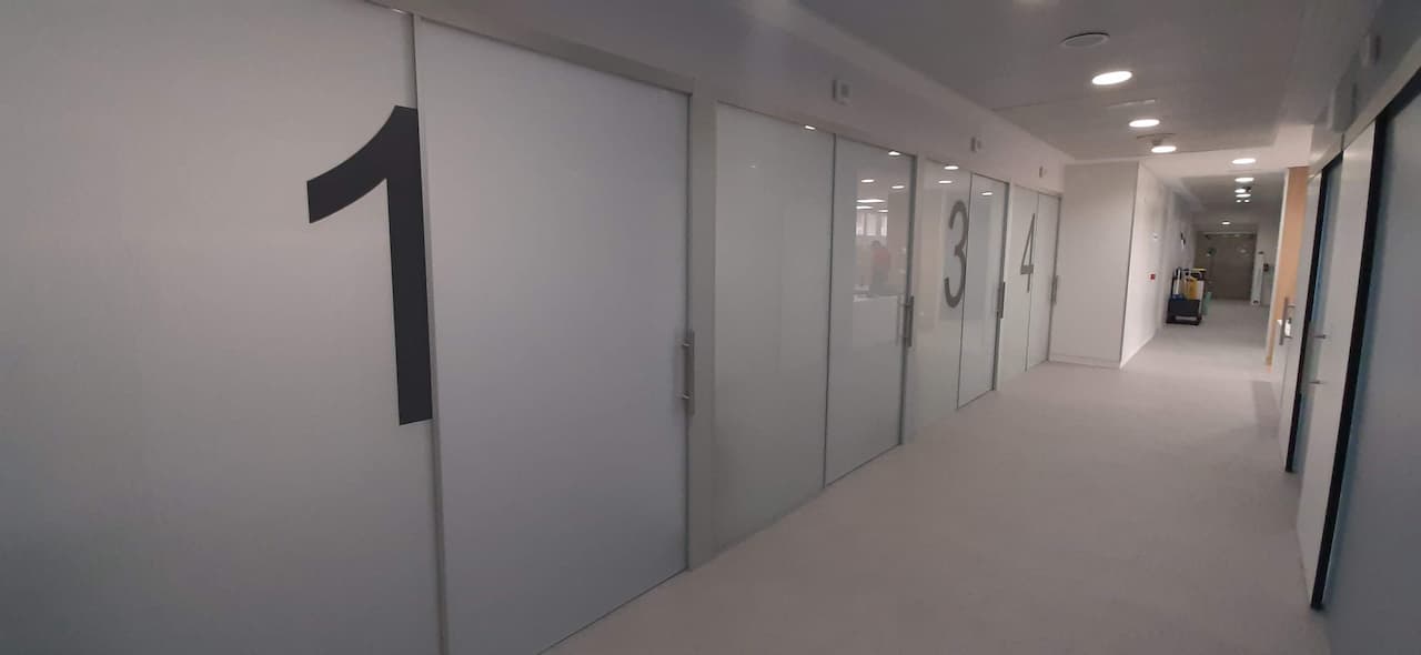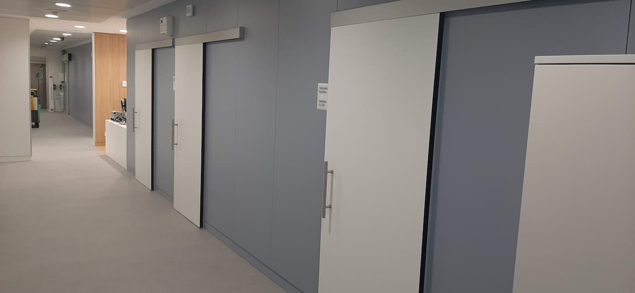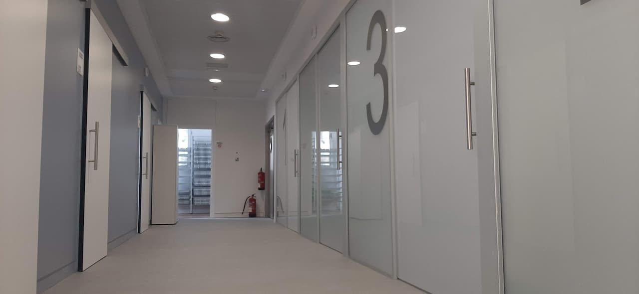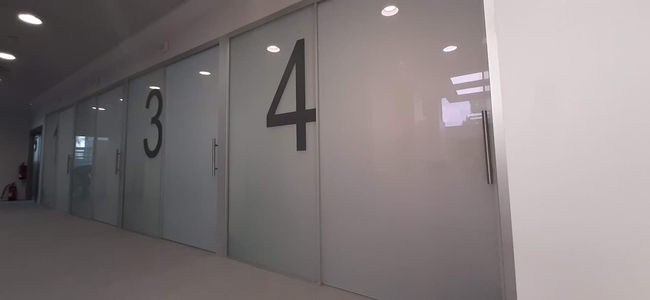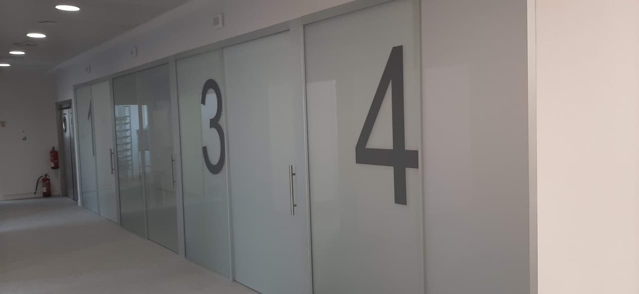 Puertas de paso correderas de vidrio y madera, vinilos inteligentes de privacidad selectiva instantánea.